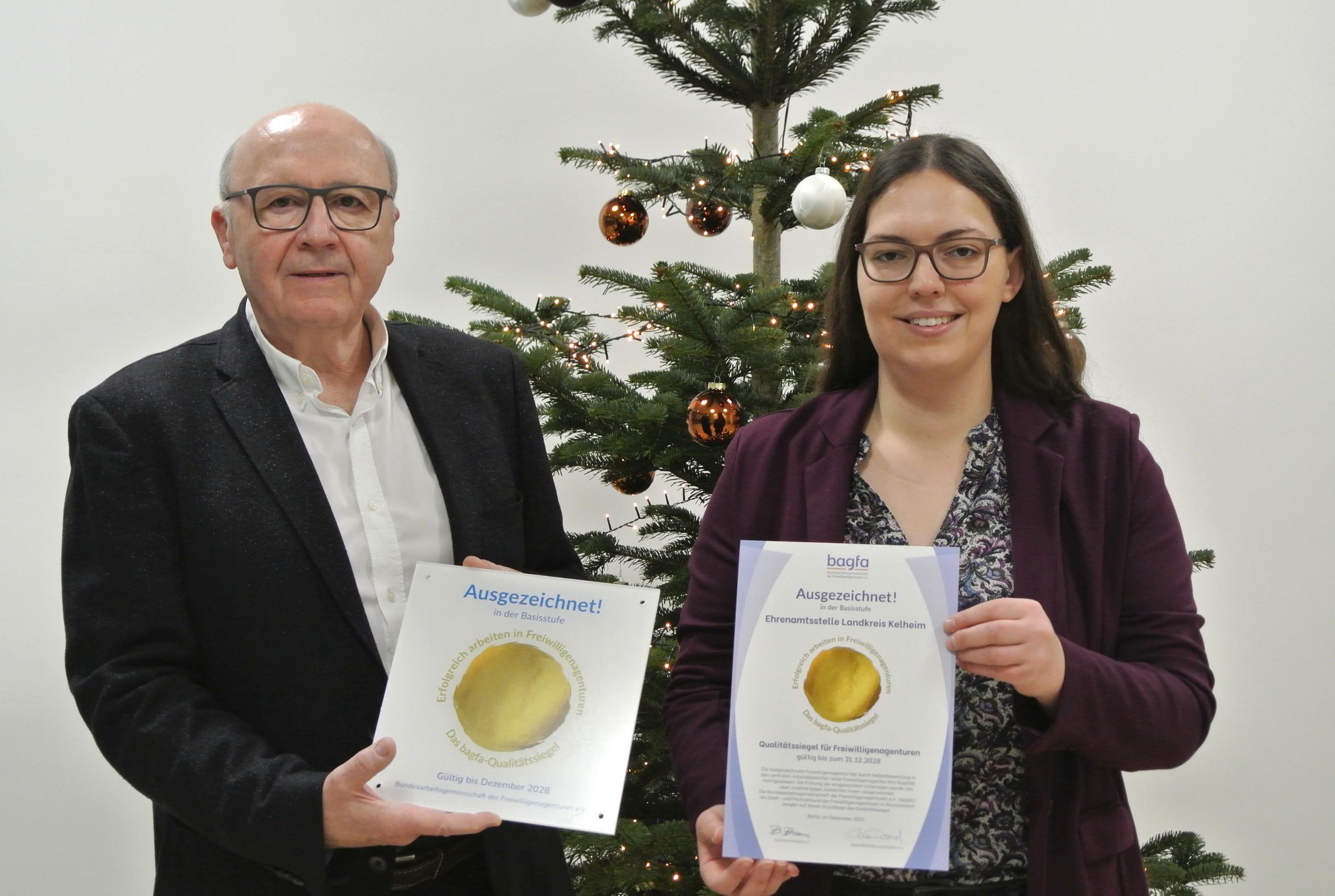 Pünktlich zu Weihnachten durften sich Landrat Martin Neumeyer und Julia Körndl von der Ehrenamtsstelle über die Verleihung des Qualitätssiegels freuen.