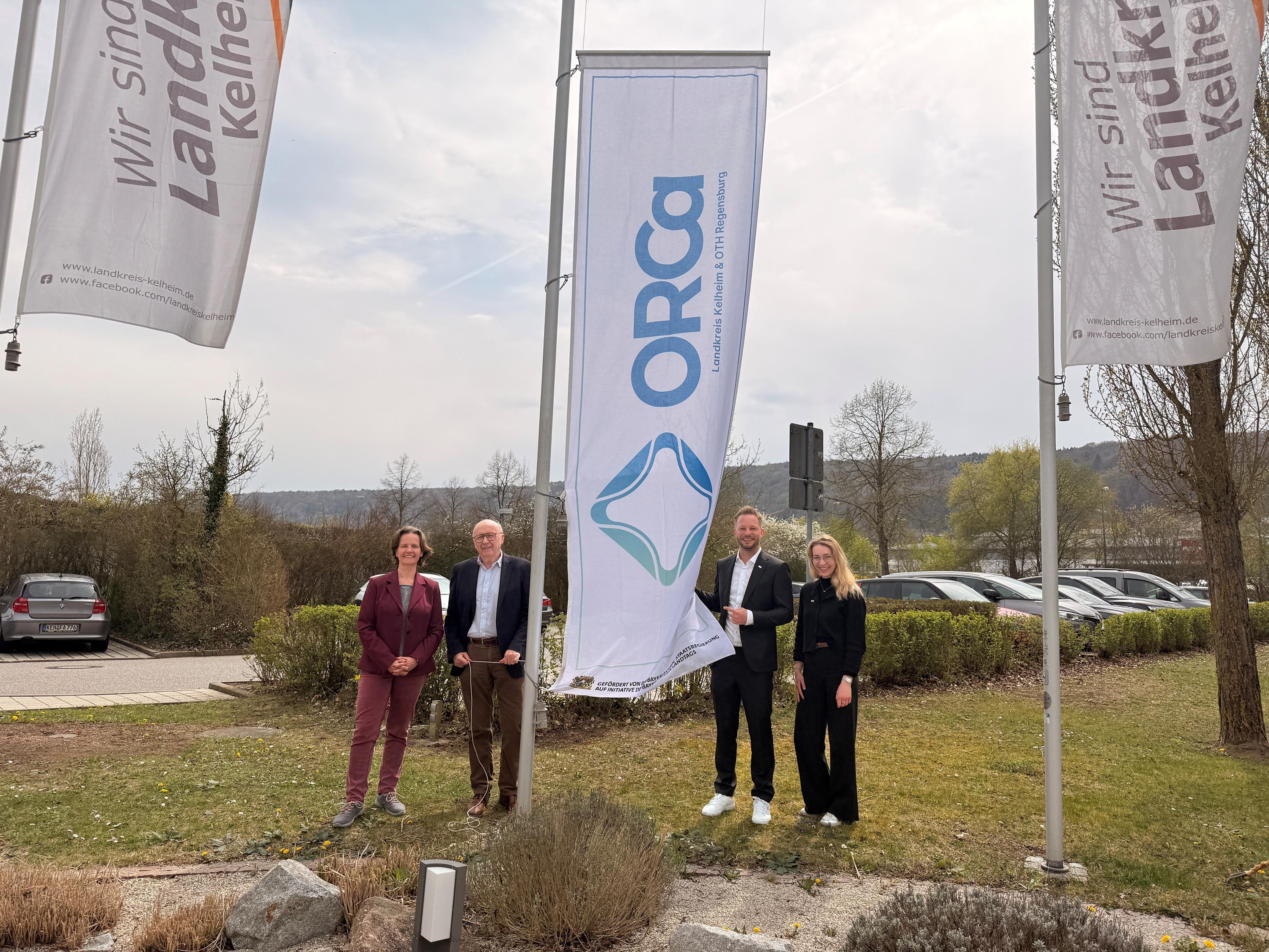 Mit einer feierlichen Fahnenhissung vor dem Landratsamt Kelheim wurde am Montag (13.4.) das neue Logo des Open Regional Campus (ORCa) erstmals öffentlich präsentiert. Im Beisein von Landrat Martin Neumeyer sowie weiterer Projektbeteiligter wird das Netzwerk damit nun auch im öffentlichen Raum sichtbar – als Symbol für die enge Verbindung von Wissenschaft, Wirtschaft und Gesellschaft im Landkreis.